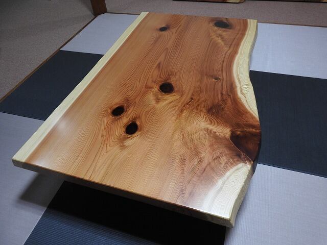 世界に一つしかない秋田杉の一枚板です。杉材の脚付きです。荷受けのお手伝いをお願いをする場合がございます。秋田杉独特の、美しいうろこの様な木目があります。ちょっとしたキズがあります。